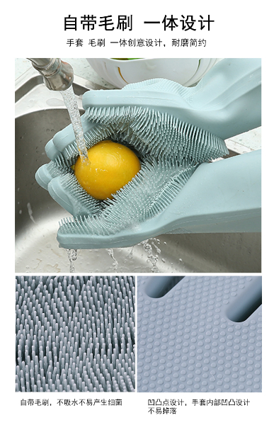 硅膠清潔手套是近年來比較火熱的廚房清潔用品。采用柔軟硅膠健康材質(zhì),手套正面有多重清潔刷頭,耐磨耐熱,強力去除污漬。