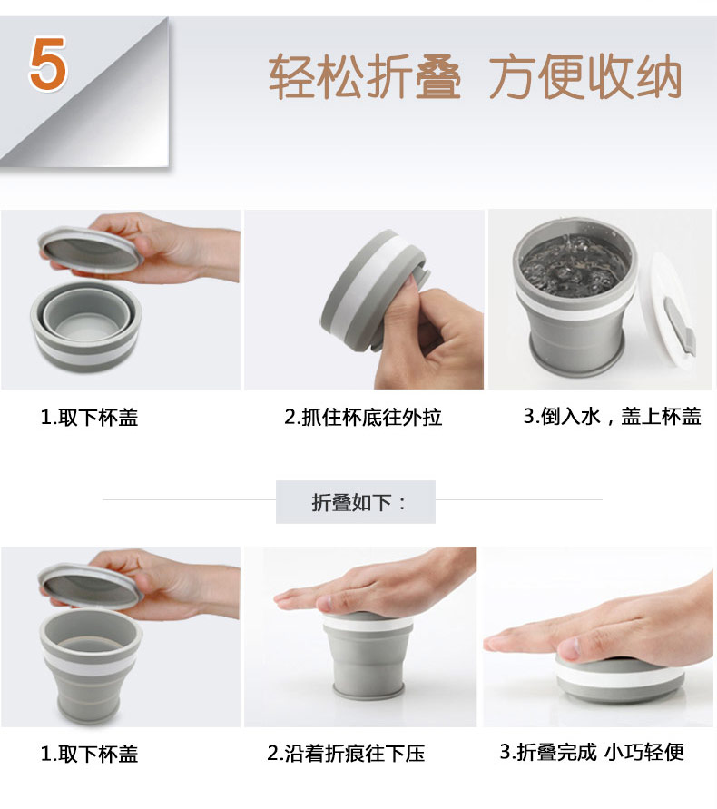 折疊式硅膠水杯成為運(yùn)動(dòng)以及郊游的便攜物品之一,水喝完后直接折疊放入口袋減小儲(chǔ)物空間替代了對(duì)水壺和瓶裝礦泉水的不足, 完全顛覆了消費(fèi)者對(duì)硅膠折疊水杯的看法,硅膠折疊杯是一種攜帶方便、使用衛(wèi)生、具有雙層杯壁的折疊杯。外壁的兩個(gè)相鄰段通過(guò)螺紋連接,內(nèi)壁的兩個(gè)相鄰段為錐形配合,可上下移動(dòng)。通過(guò)外壁螺紋旋轉(zhuǎn)驅(qū)動(dòng)內(nèi)壁上下展開(kāi),實(shí)現(xiàn)杯形折疊和拉伸動(dòng)能。